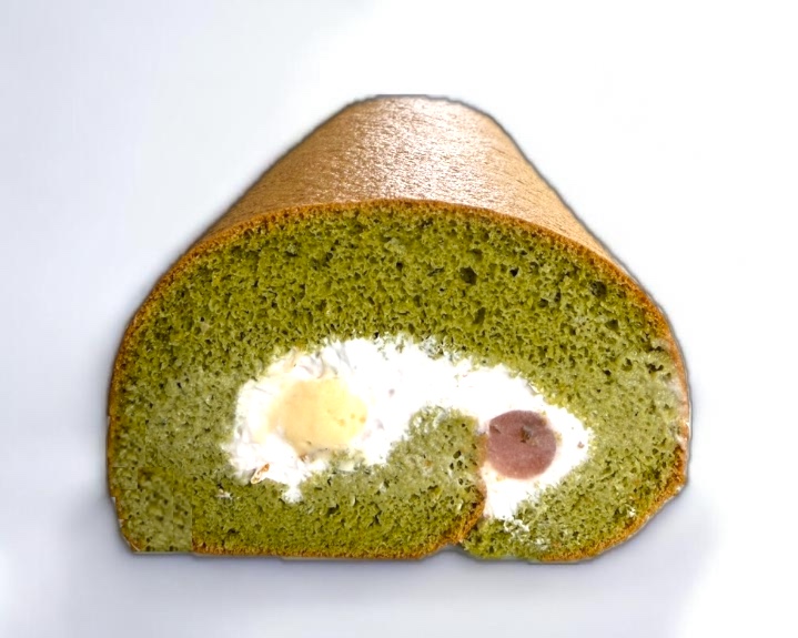 ふんわりしっとりした抹茶の生地に苺のピューレを混ぜ込んだ生クリームと駒ヶ岳牛乳で炊いたカスタードクリーム、桜あんを巻き込みました。
